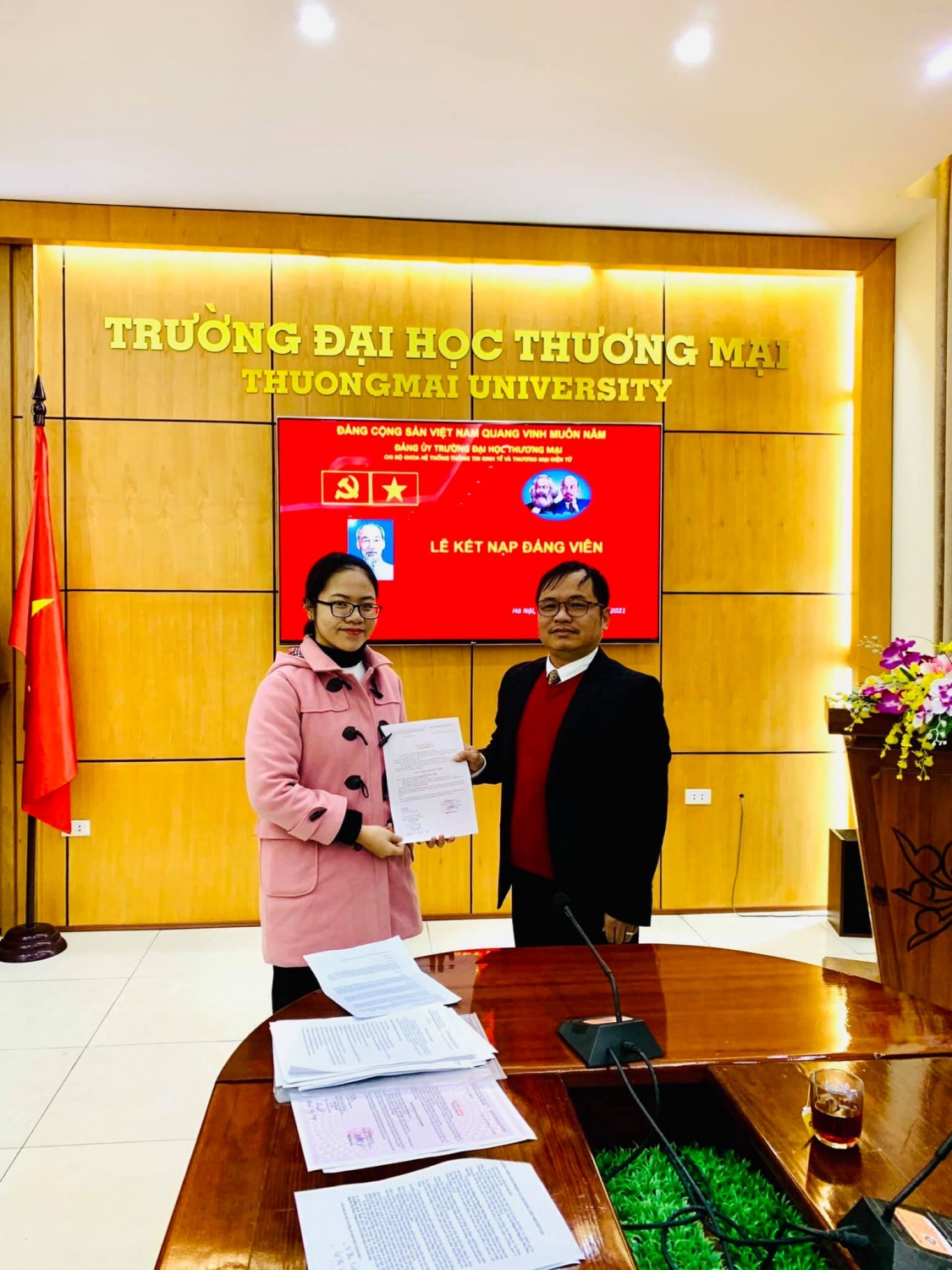 Sáng nay, Ngày 8/1 tại phòng họp số 1 nhà I, được sự đồng ý của Đảng uỷ Trường ĐH Thương mại, Chi bộ Khoa HTTT Kinh tế và TMĐT đã tổ chức Lễ kết nạp Đảng cho các quần chúng: