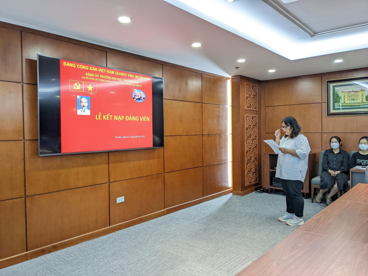Được sự đồng ý của Đảng uỷ trường Đại học Thương mại, sáng ngày 26/08/2022, tại Phòng khánh tiết nhà F, Chi bộ Khoa HTTT Kinh tế và TMĐT đã tổ chức Lễ kết nạp Đảng cho các quần chúng: 1. Lê Phương Thuý - Sinh viên lớp K55S1 - Khoa HTTT Kinh tế và TMĐT - Trường Đại học Thương mại 2. Nguyễn Ngọc Minh Châu- Sinh viên lớp K55S2 - Khoa HTTT Kinh tế và TMĐT - Trường Đại học Thương mại Sau khi tuyên thệ, Chi bộ phân công các đ/c Đảng viên: Đ/c Nguyễn Thị Hội giúp đỡ đ/c Lê Phương Thuý , Đ/c Nguyễn Thị Hiền giúp đỡ đ/c Nguyễn Ngọc Minh Châu. Chúc mừng hai đồng chí đã được đứng trong hàng ngũ Đảng viên Đảng cộng sản Việt Nam. Chúc cho các đồng chí Đảng viên mới luôn: Thực hiện tốt những nhiệm vụ của Đảng viên ở Điều 2 của Điều lệ Đảng Cộng sản Việt Nam Phát huy những quyền hạn theo QĐ trong Điều 3 của Điều lệ Đảng Cộng sản Việt Nam Tiếp tục rèn luyện, phấn đấu trong học tập, nghiên cứu khoa học và hoạt động phong trào, đoàn thể của Khoa HTTT Kinh tế và TMĐT. Sau khi lễ kết nạp đảng, Đồng chí Nguyễn Hưng Long- Bí thư chi bộ Khoa Hệ thống TTKT & TMĐT trao quyết định công nhận Đảng viên chính thức cho 4 đồng chí: 1. Đ/c Đào Thị Lý K54I1 2. Đ/c Trần Thị Linh Chi K53I4 3. Đ/c Lê Hương Giang K53S2 4. Đ/c Nguyễn Thị Thuỳ Trang K53S4 Chúc mừng 4 đồng chí đã trở thành đảng viên chính thức và mong rằng các đồng chí sẽ phát huy năng lực tối đa trong các hoạt động xứng đáng với vai trò của người Đảng viên trẻ! Một số hình ảnh trong buổi lễ: