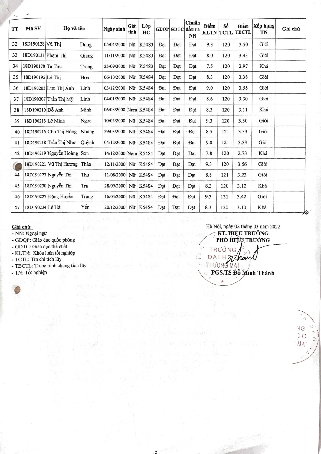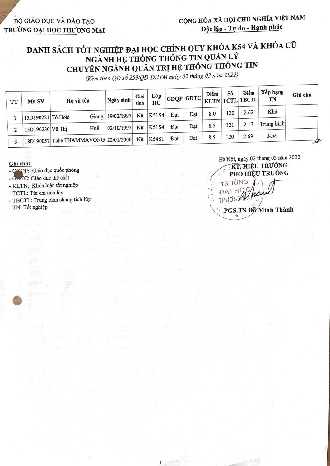 Quyết định 259/QĐ-ĐHTM của Đại học Thương mại ngày 02 tháng 03 năm 2022 về việc công nhận tốt nghiệp đại học chính quy cho 50 sinh viên chuyên ngành Quản trị hệ thống thông tin khóa 54 và Khóa cũ.