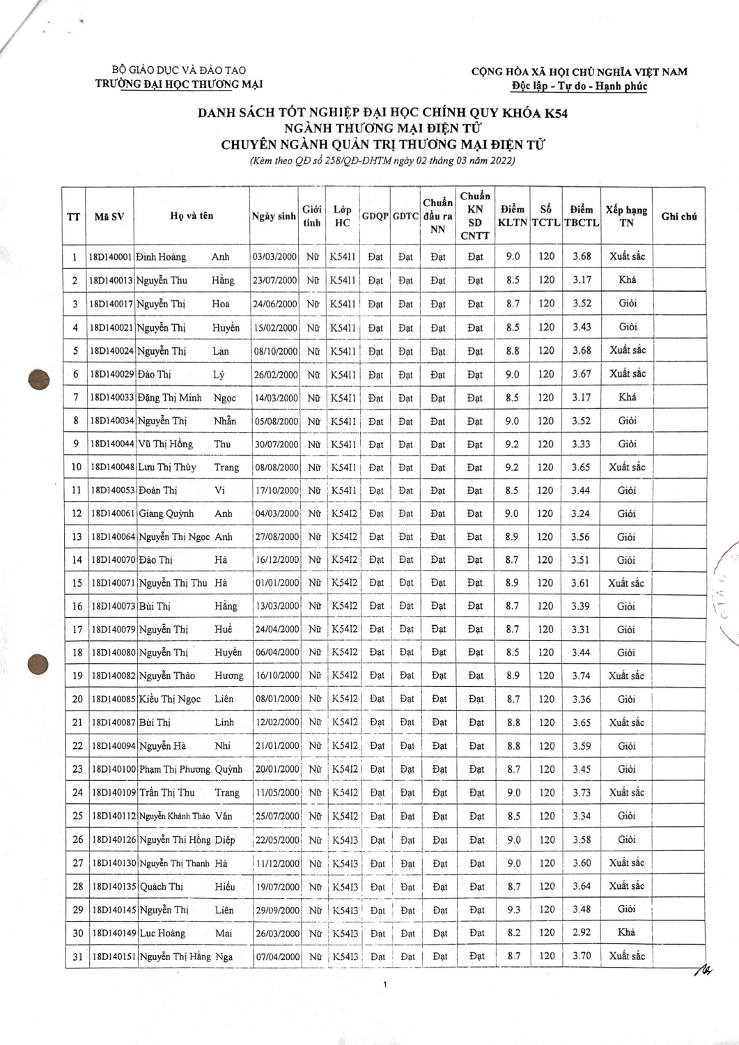 Quyết định 258/QĐ-ĐHTM của Đại học Thương mại ngày 02 tháng 03 năm 2022 về việc công nhận tốt nghiệp đại học chính quy cho 98 sinh viên chuyên ngành Quản trị Thương mại điện tử khóa 54 và Khóa cũ.