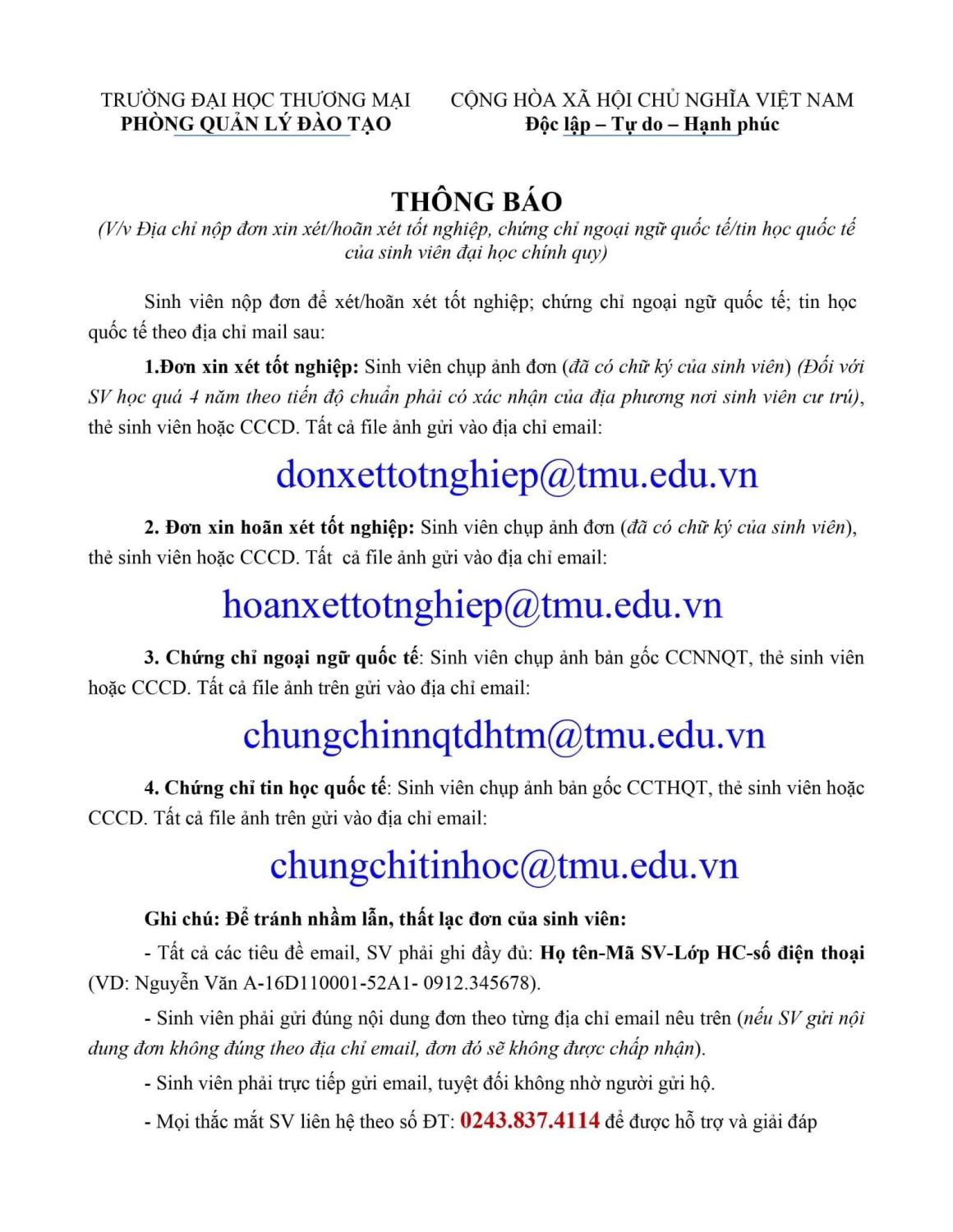 Thông báo địa chi nộp đơn để xét/hoãn xét tốt nghiệp; chứng chỉ ngoại ngữ quốc tế/tin học quốc tế của sinh viên đại học chính quy.