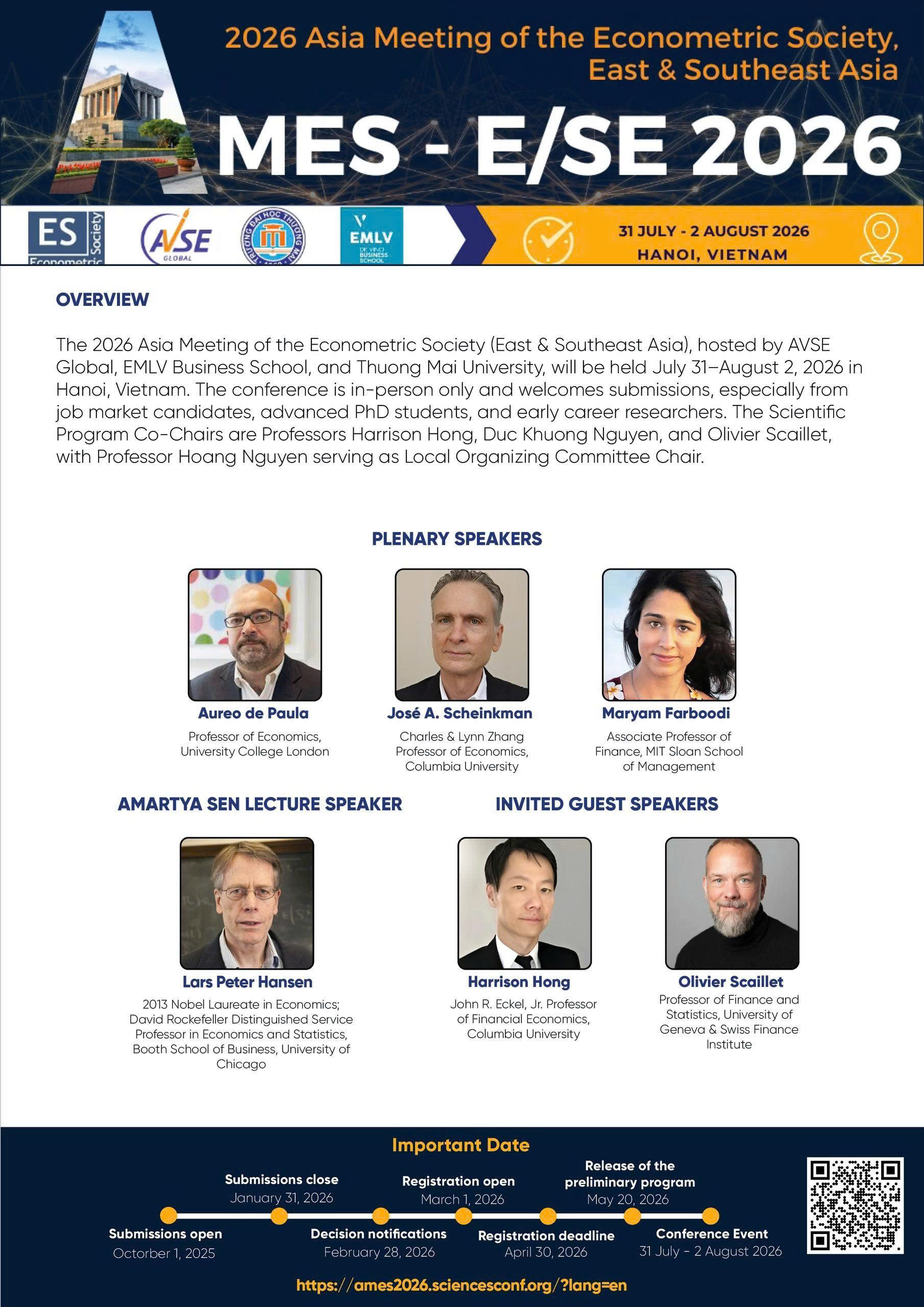 Hội nghị AMES 2026 sẽ diễn ra từ ngày 31/07 đến 02/08/2026 tại Hà Nội. Đây là sự kiện quy tụ các học giả và nhà nghiên cứu hàng đầu để thảo luận về những công trình tiên phong trong lĩnh vực Kinh tế lượng, Kinh tế học, Tài chính quốc tế và các lĩnh vực liên quan.