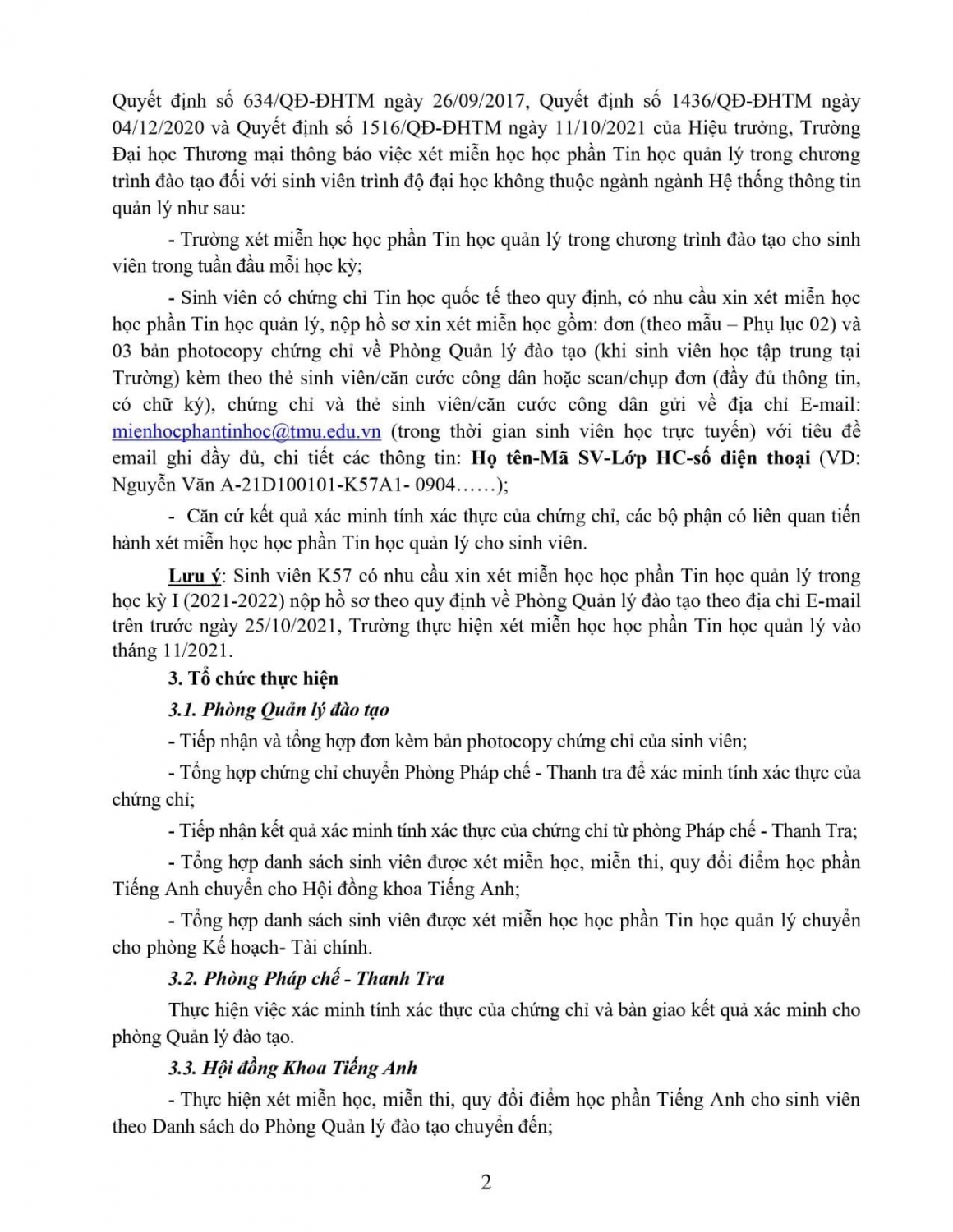 Thời gian xét: tuần đầu mỗi học kỳ Đối tượng áp dụng: Sinh viên trình độ đại học từ khóa tuyển sinh năm 2021 Phương thức: Sinh viên K57 có nhu cầu xét miễn học, miễn thi, quy đổi điểm Tiếng Anh và miễn học học phần Tin học quản lý trong học kì I 2021-2022 nộp hồ sơ theo đúng quy định về Phòng Quản lý đào tạo vào tháng 11/2021.