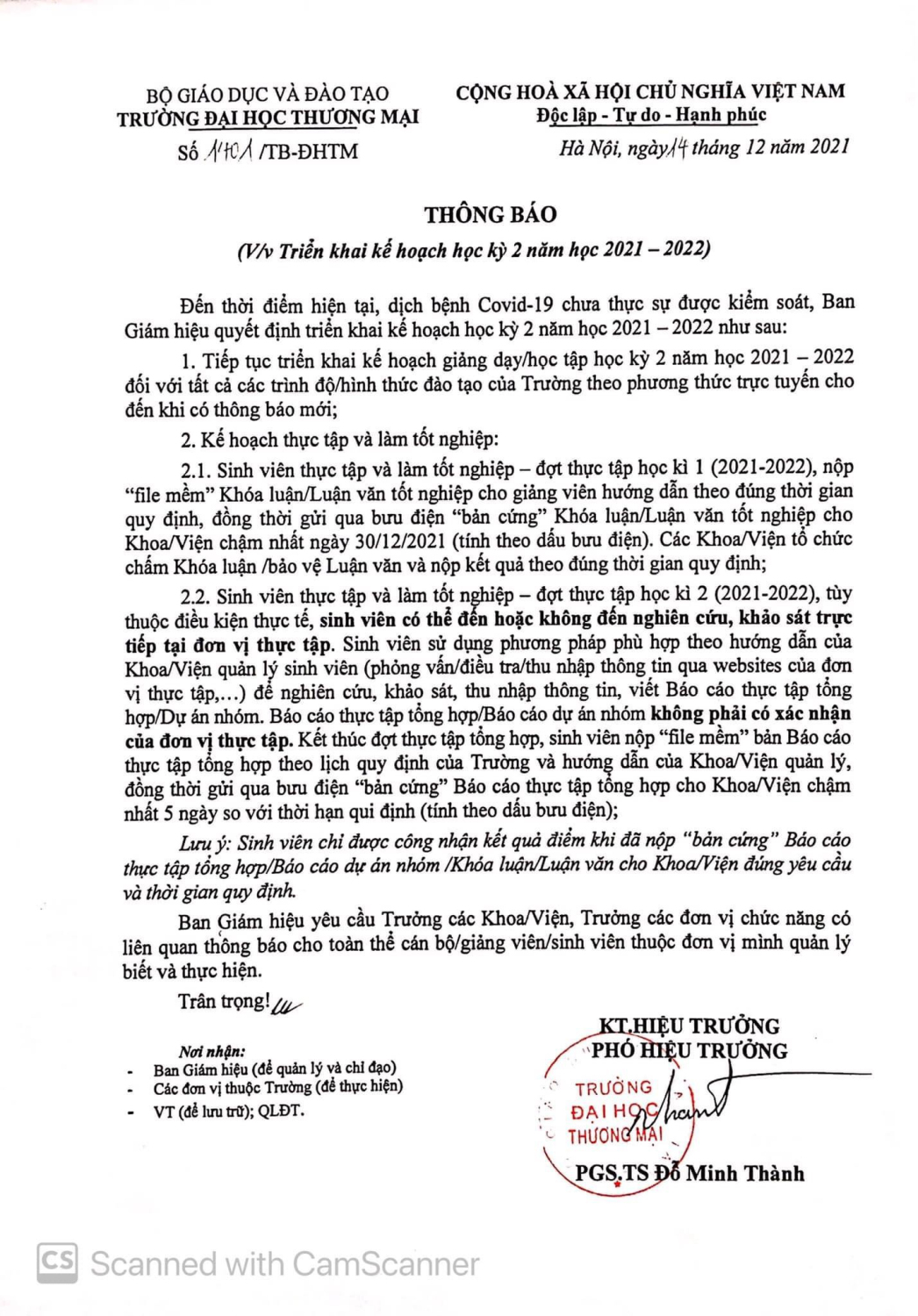 Đến thời điểm hiện tại, dịch bệnh Covid-19 vẫn chưa thực sự được kiểm soát, Ban Giám hiệu quyết định triển khai kế hoạch học kỳ 2 năm học 2021-2022 như sau: